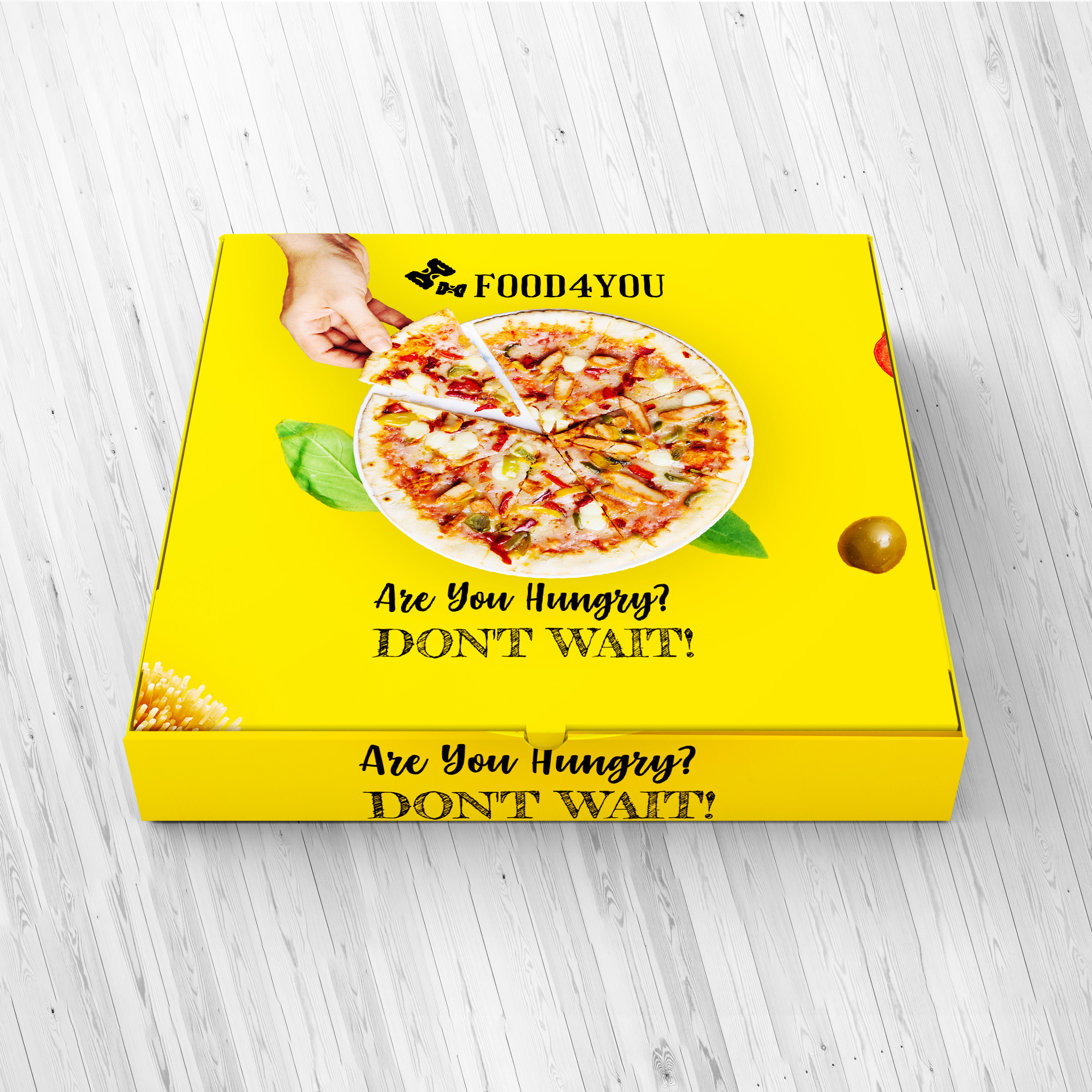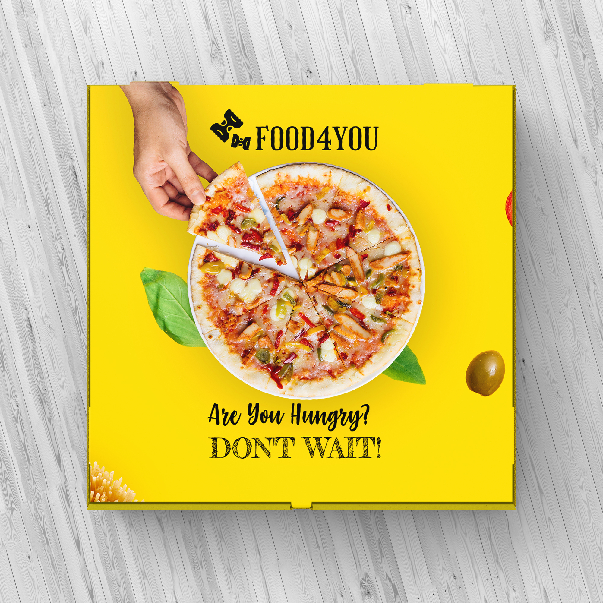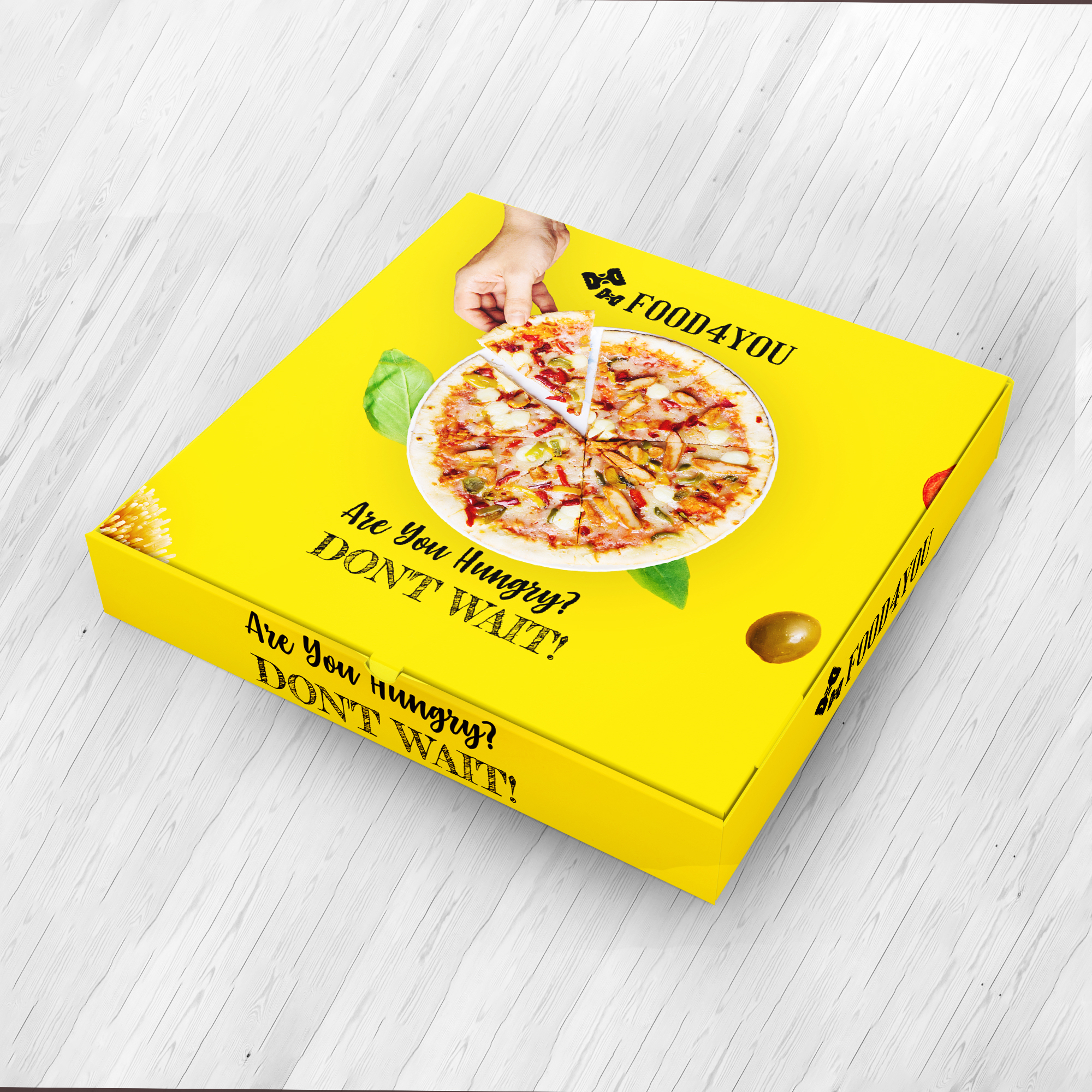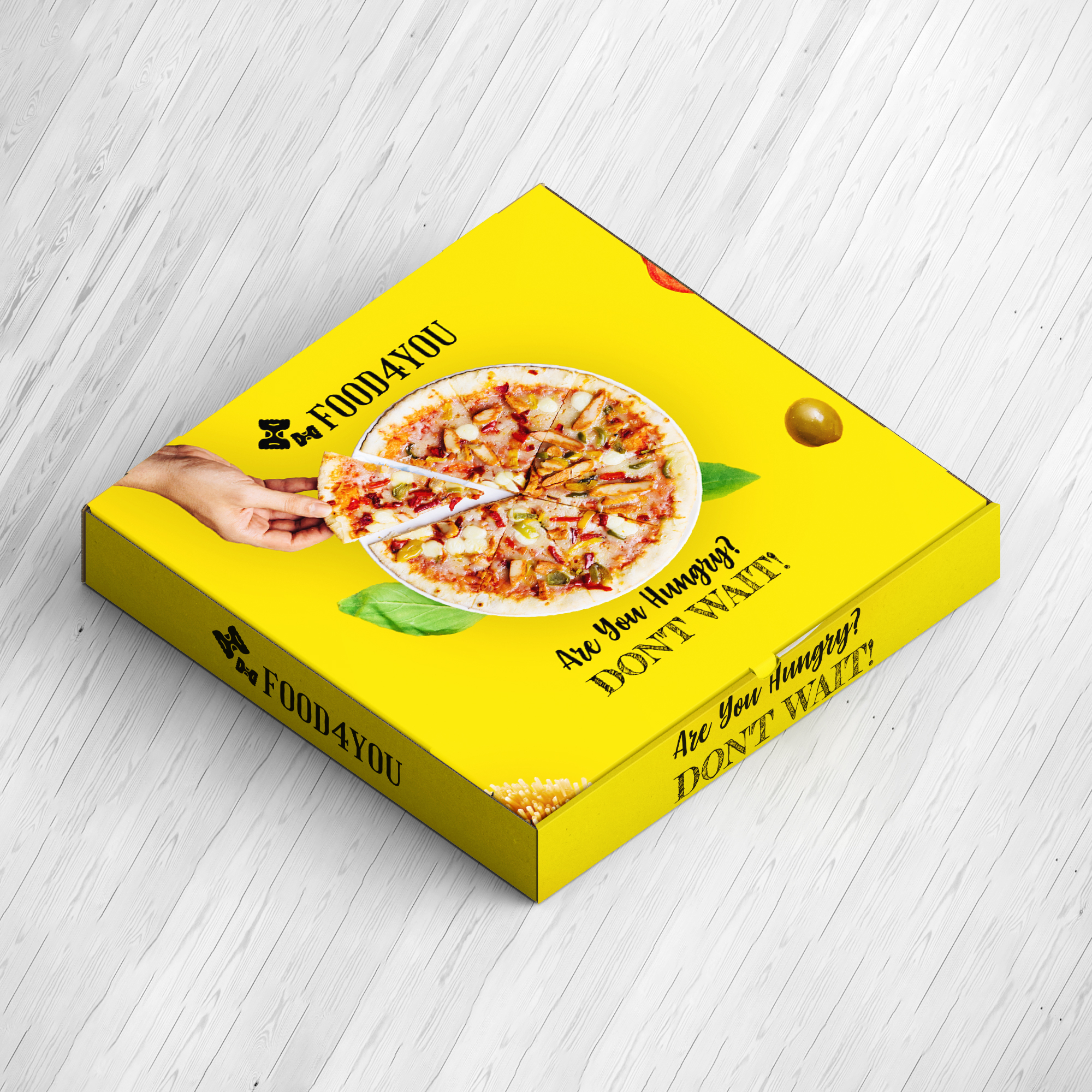 This pizza box design features a clean, modern aesthetic with bold branding elements that immediately capture attention. The layout highlights the logo prominently at the center, supported by sharp typography and balanced spacing. A warm, appetizing color palette—typically including shades of red, yellow, or earthy tones—creates a strong connection to classic pizza branding. Subtle graphic accents, such as illustrated toppings, patterns, or stamp-style badges, add character without overcrowding the design. The overall look is minimalist yet inviting, ensuring the packaging feels premium, hygienic, and aligned with contemporary food packaging standards. Ideal for both dine-in and delivery services, this design enhances brand visibility while maintaining a professional and appealing presentation.