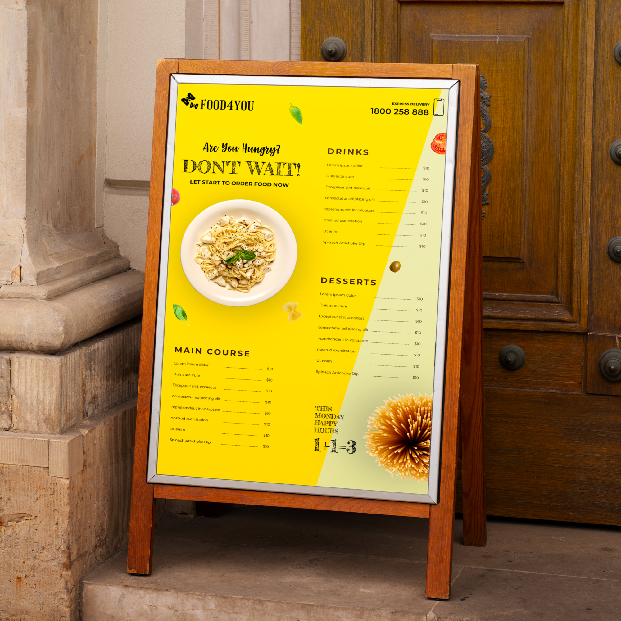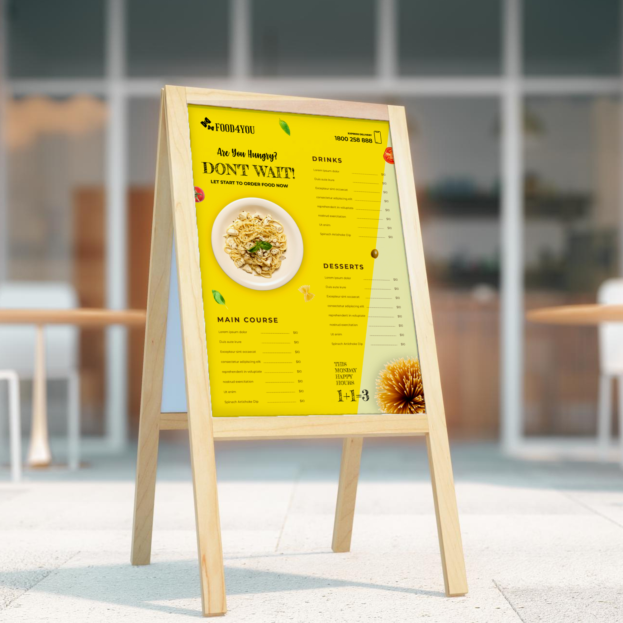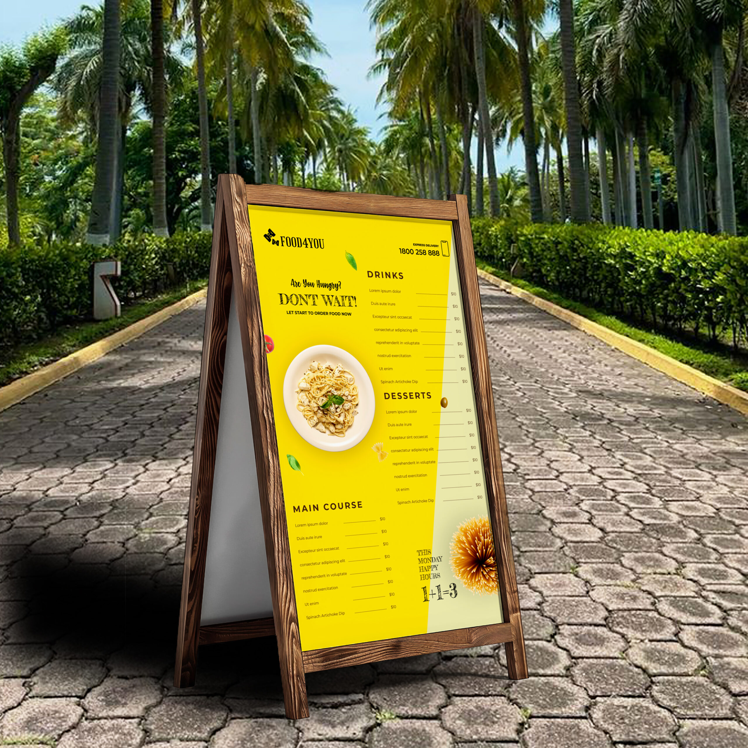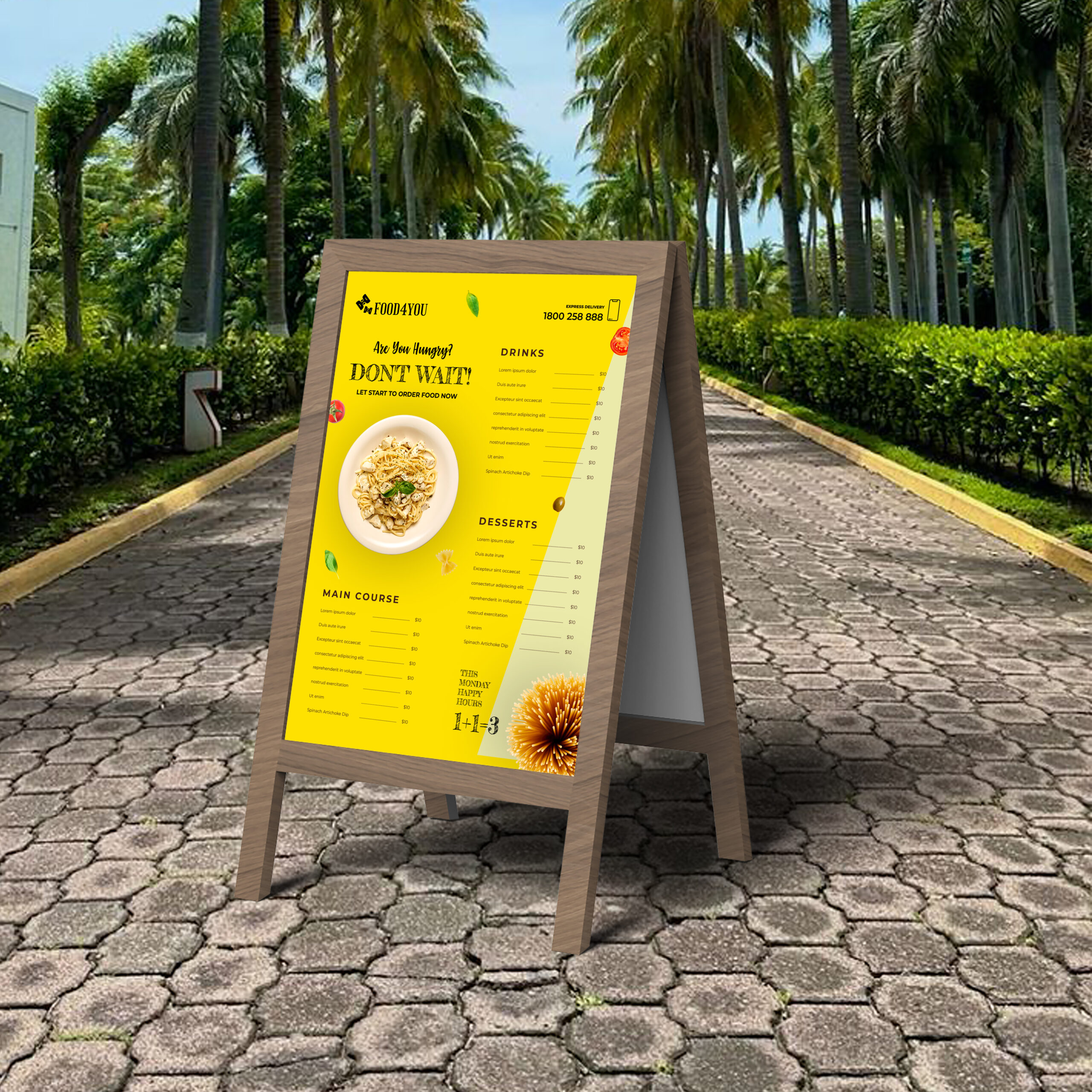 This sunboard design offers a bold and visually striking presentation, perfect for high-impact brand visibility in both indoor and outdoor settings. The layout prominently features the logo, key message, or promotional headline at the center or top, using large, clear typography to ensure high readability from a distance. Supporting details—such as service highlights, contact info, QR code, or social handles—are arranged neatly at the bottom or side, maintaining visual balance without overwhelming the design.